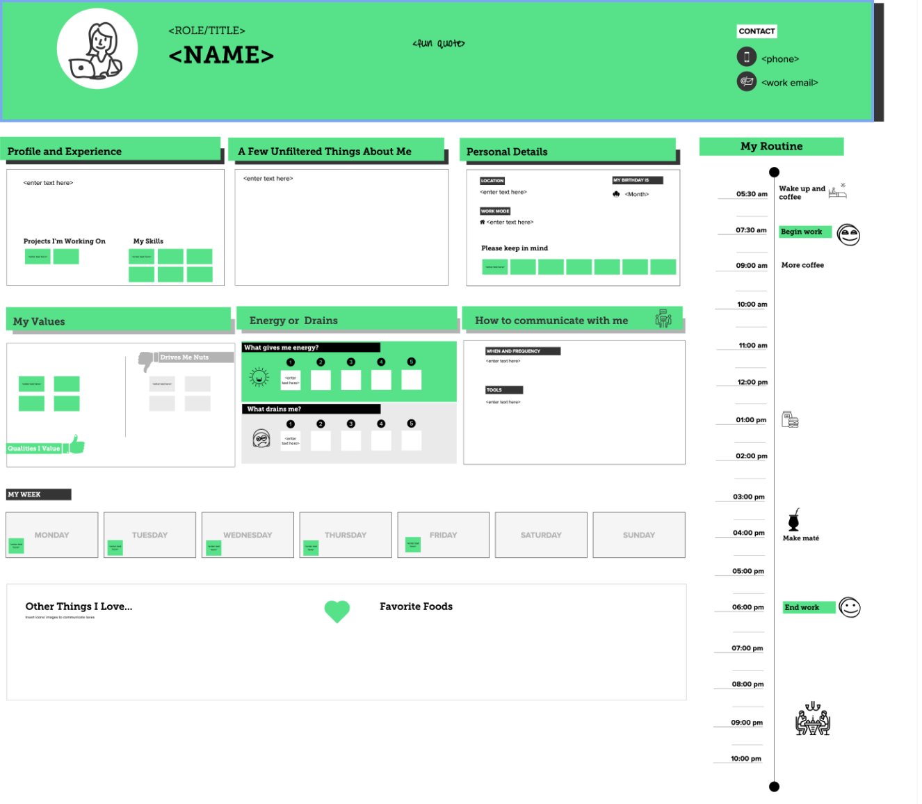 You have likely heard of a personal user manual in the workplace, it goes by many different names such as a "bio", "user manual", or "guide to working with me", to name a few. When used effectively, a user manuals can accelerate the formation of a new team, and help individuals feel comfortable with one another while developing an understanding of how the group likes to work. This is done by sharing personal details and work preferences, embracing your collective quirks, and finding opportunities to bond through shared goals, values, and interests. Finding shared points of commonality while developing an understanding differences in communication and working styles can help avoid misunderstandings among team members and build the foundation for deeper relationships between both existing and new employees. This critical element of team-building is a great tool for in-person, hybrid, or fully remote teams.